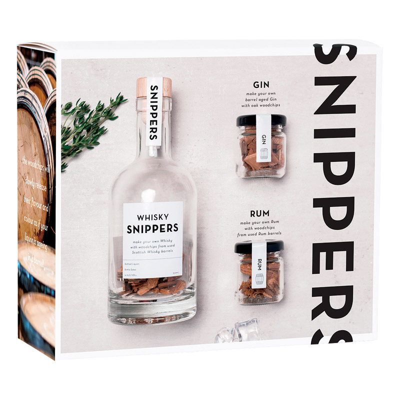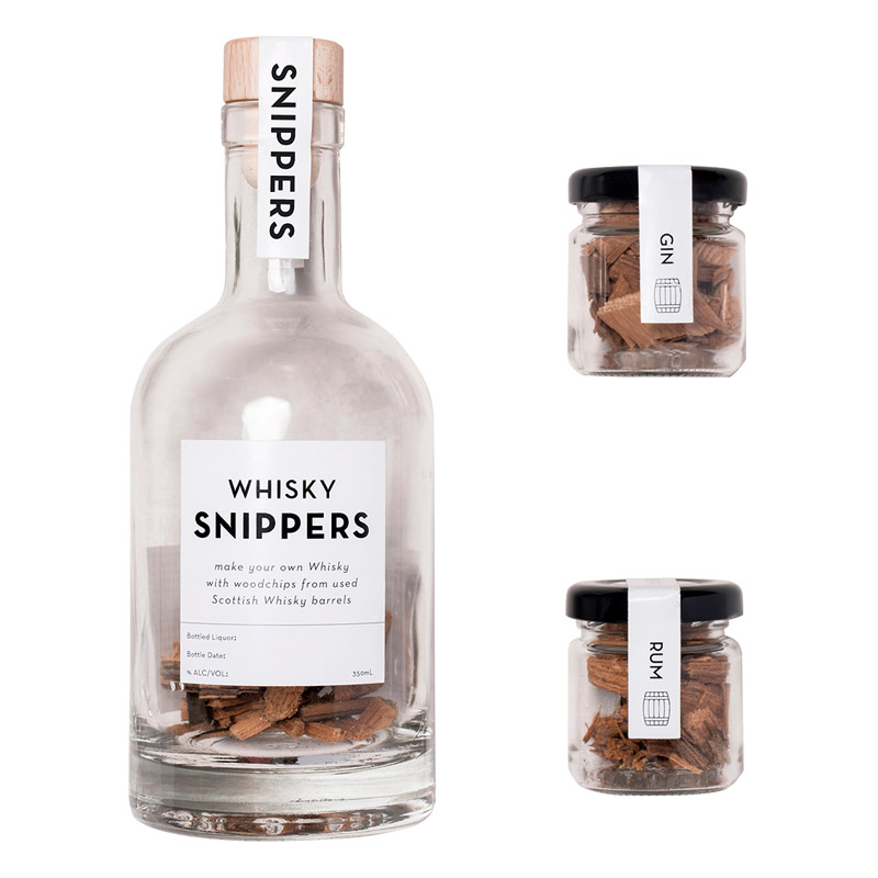 | コピー | ガラスボトルの中には最高級のお酒を造った後の樽を砕いたウッドチップが詰められており、ウォッカやドライジンなどの蒸留酒を加えると、時間をかけてまるで本物の木樽で蒸留酒を熟成させたような芳醇な風味と美しい琥珀色に変化します。ウッドチップはすべてオーク材を使用しています。すぐに使えるSNIPPERSウィスキーボトル1本と、2種のフレーバー(ジン・ラム)のリフィル(350ml用)が入った、愛飲家にはたまらないギフトセット。 |