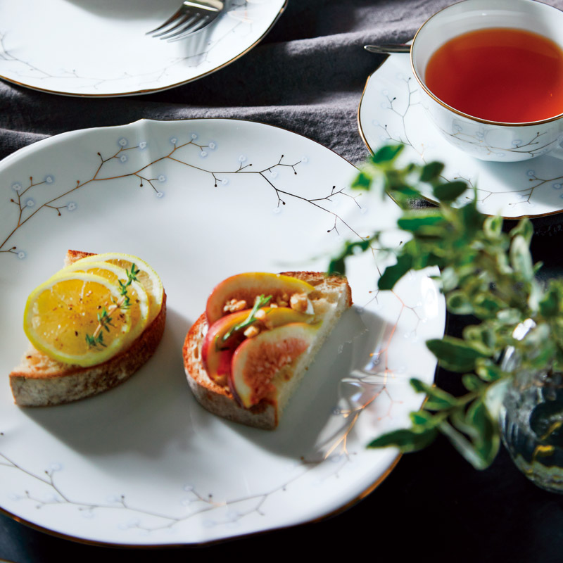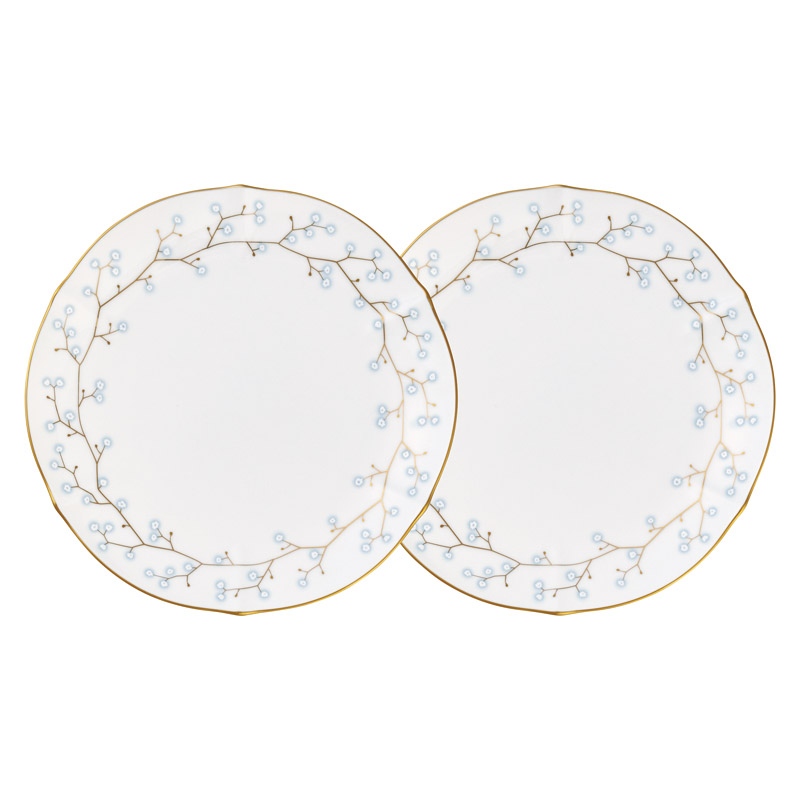 幸福や感謝を意味するかすみ草を花冠のモチーフに。白とブルーで表現した爽やかな花を電子レンジ対応のゴールド装飾が引き立てます。