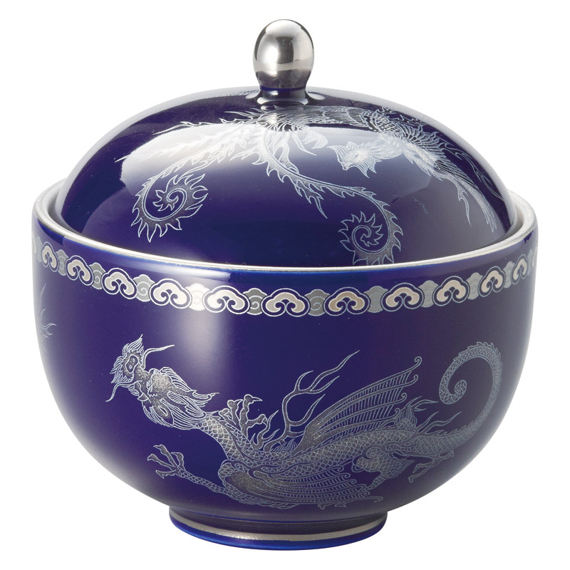 人々を災いから守る中国神獣の中から龍、鳳凰、白虎、玄武、麒麟の五神獣を蓋物全体に配置。香蘭社独自の瑠璃釉に銀彩で表現、落ち着きと高級感あふれる仕上がりです。