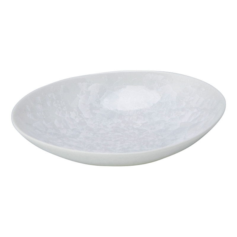 美しい器体に広がる結晶釉。白色で様々な料理に合わせやすく日々重宝する楕円鉢です。