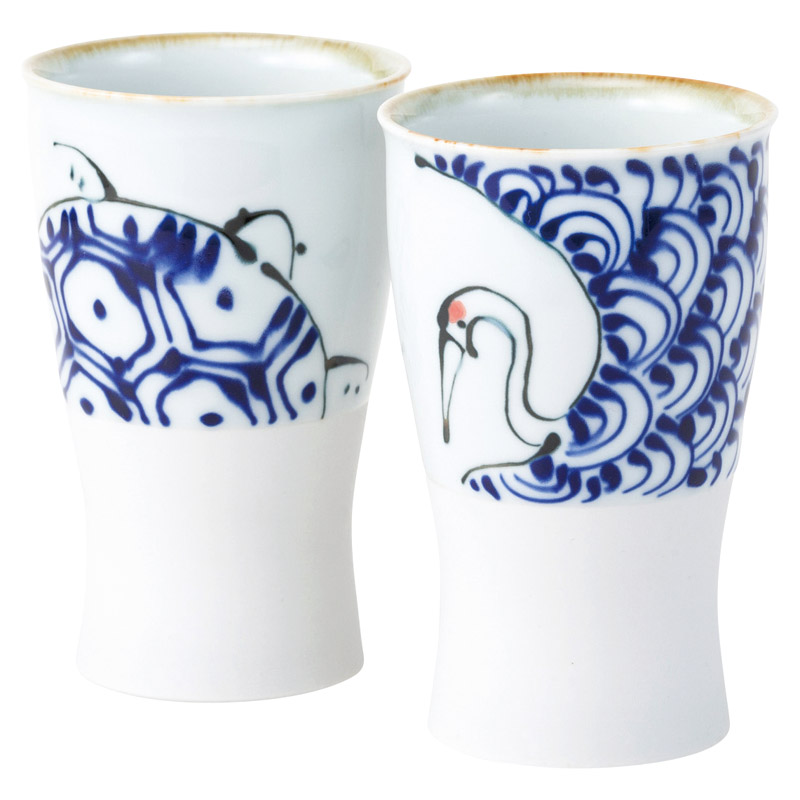 長寿を祈願する鶴と亀のデザイン。持ち易い形状とサイズ感の陶製グラスペアセットです。