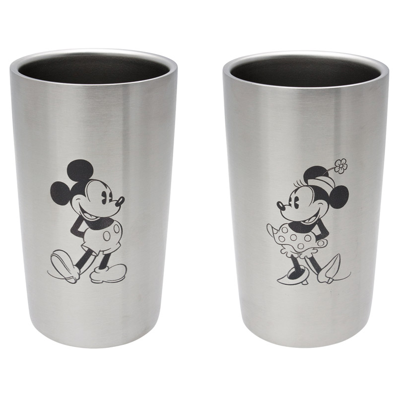 スタンディングのミッキーとミニーが描かれた落ち着いた雰囲気のステンレスタンブラー。保温保冷効果の高い真空2重構造です。 |