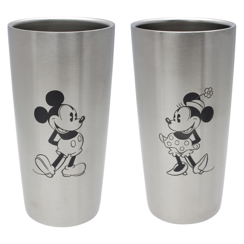 スタンディングのミッキーとミニーが描かれた落ち着いた雰囲気のステンレスタンブラー。保温保冷効果の高い真空2重構造です。 |