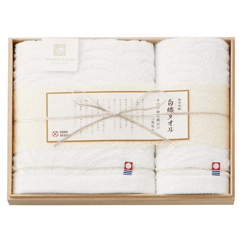 高吸水と白さ際立つ細部へのこだわりを追求した「今治本晒」。今治の自然の美からとったデザインを高い技術で表現しました。 |