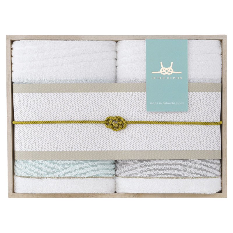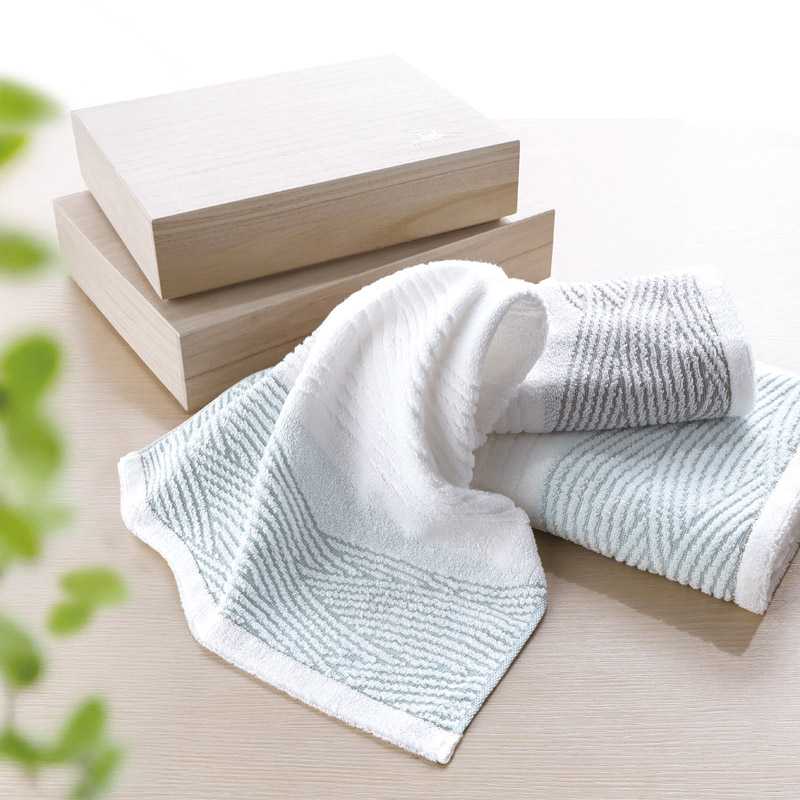 タオルの産地である愛媛県今治市で生まれた「瀬戸内逸品」。瀬戸内海をイメージしたデザインのタオルを木箱にセットした、高級感のあるタオルギフトです。