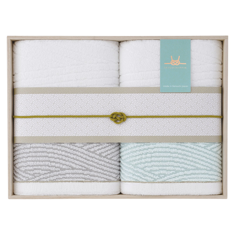 タオルの産地である愛媛県今治市で生まれた「瀬戸内逸品」。瀬戸内海をイメージしたデザインのタオルを木箱にセットした、高級感のあるタオルギフトです。