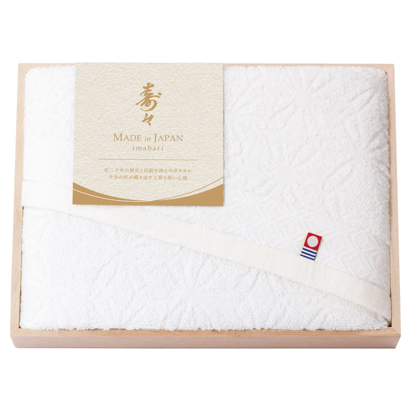 人の一生を表す紅白の色彩に成長を願う麻の葉模様を織り上げた格調高い木箱入りの今治タオル。成長の願いを込めた紅白の今治タオルは、お祝いや感謝の気持ちを込めて大切な方への贈りものに。