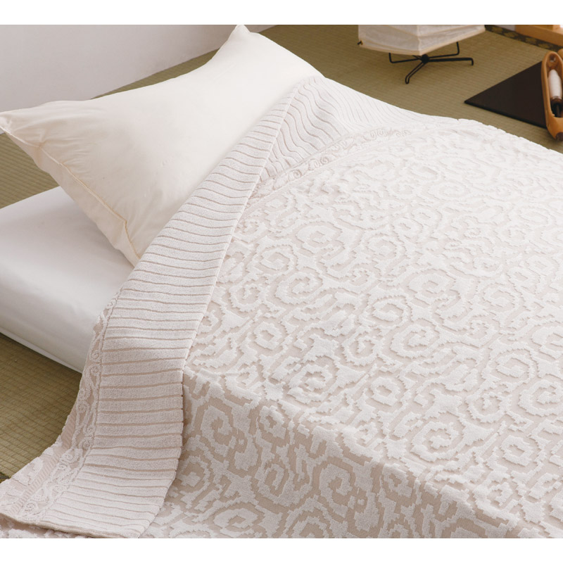 今治のジャカードタオルの歴史は大正時代に始まる国内の先駆的技術です。この紋織タオルケットは、名水、今治・蒼社川の水で糸を晒した伝統的な製法と匠の織により作られました。