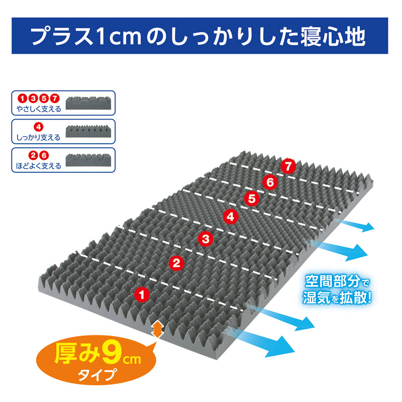 | コピー | 通気性がよく、ほどよい硬さで無理なく寝返りをサポート。身体に合わせた構造が腰や肩への負担を軽減します。側地は取り外して丸洗い可能です。ベッドマットレスの上に重ねて、また、床に直接敷いてお使いいただけます。ご使用なさらないときは風通しのよいところにたてかけておくだけで大丈夫です。プラス1㎝のしっかりした寝心地。 |