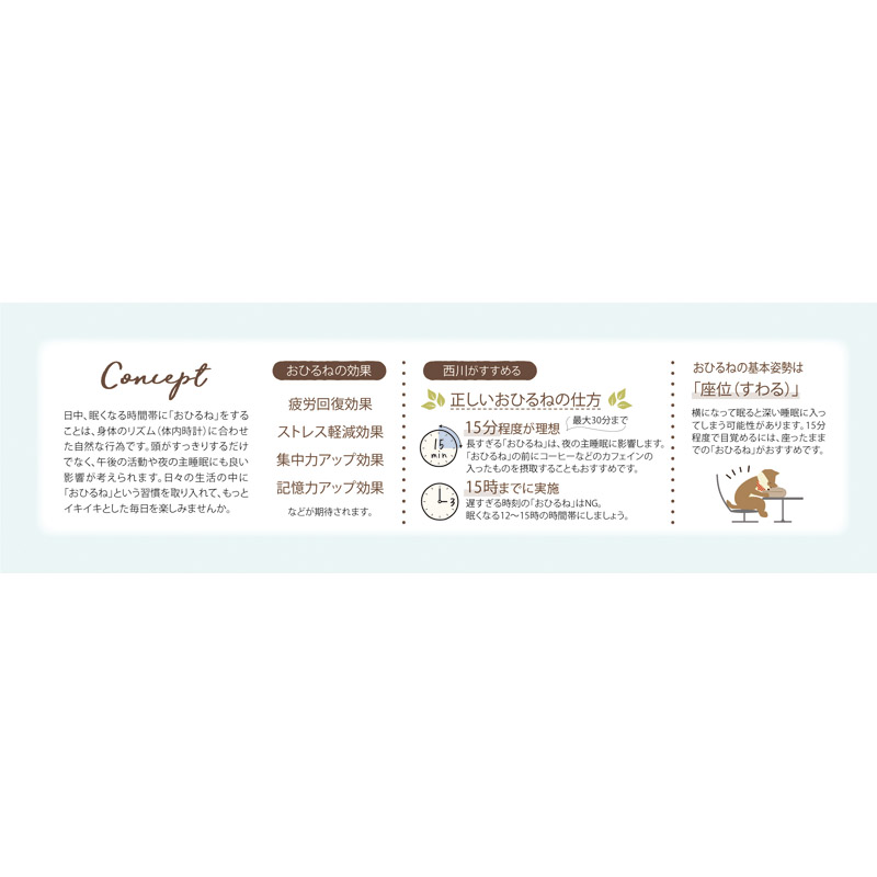 | コピー | 「パワーナップ」とは短時間の昼寝のことで、仕事の生産性を上げる手段として効果的。からだのリズム(体内時計)に合わせて、午後の仕事に取りかかる前にお昼寝をすることで、頭がスッキリし集中力アップが期待できます。「こねむり」は、そんなパワーナップをサポートするアイテムです! |