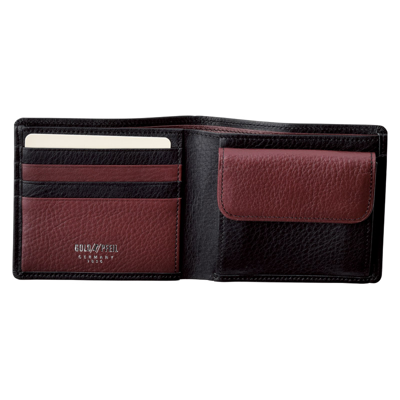 手触りの良いソフトな牛革を使用し、内作りにワインカラーの革を用いて、おしゃれな感覚に仕上げました。・札入×2・カード入×8・ポケット×3・ホック式小銭入×1(中×2)