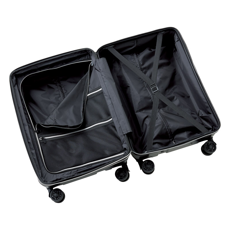 | コピー | ファスナーを開けるとマチ幅が拡張し、容量がアップします。●ファスナー開閉式●メッシュファスナーポケット×2●固定バンド付●TSAロック付●4輪キャスター |