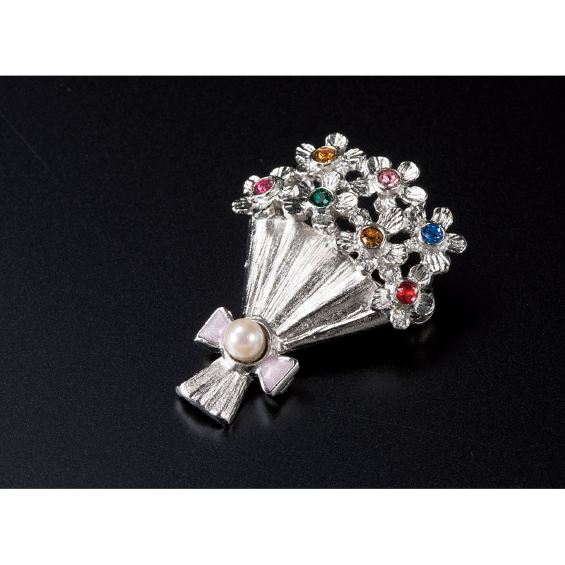 花束をモチーフにしたアコヤ本真珠ブローチです。ブーケがリアルに表現されています。希少なベビーパールがワンポイントです。 |