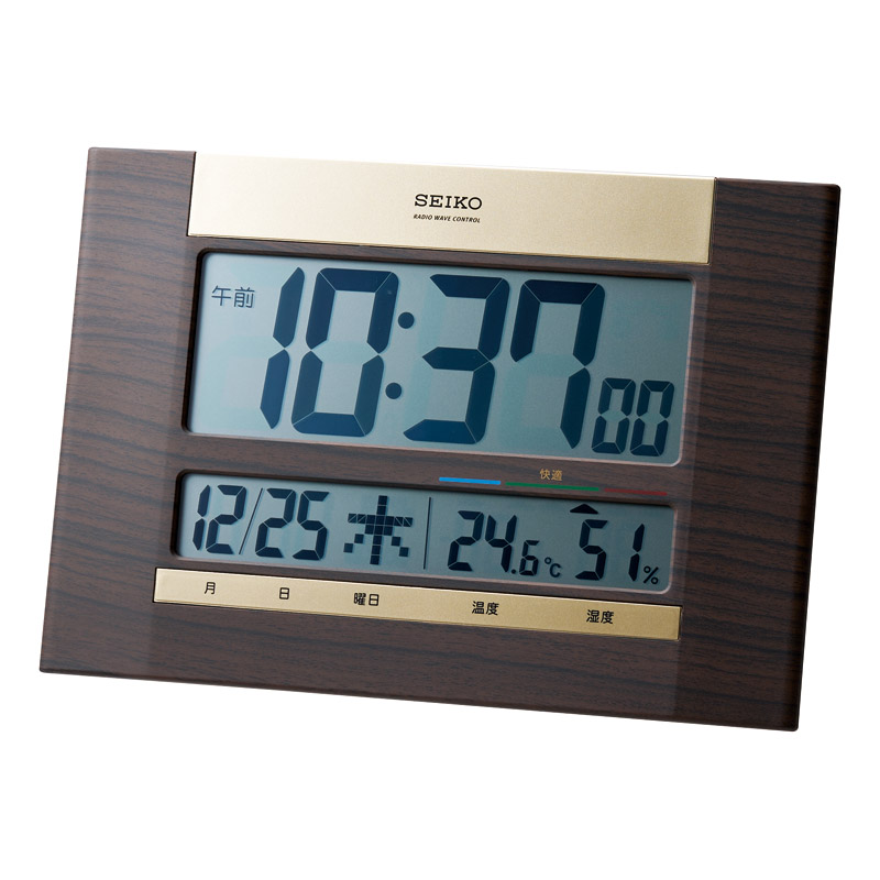 木目模様で高級感のある薄型設計。快適度表示が健康管理を応援します。○温度・湿度表示○フルオートカレンダー○掛置兼用