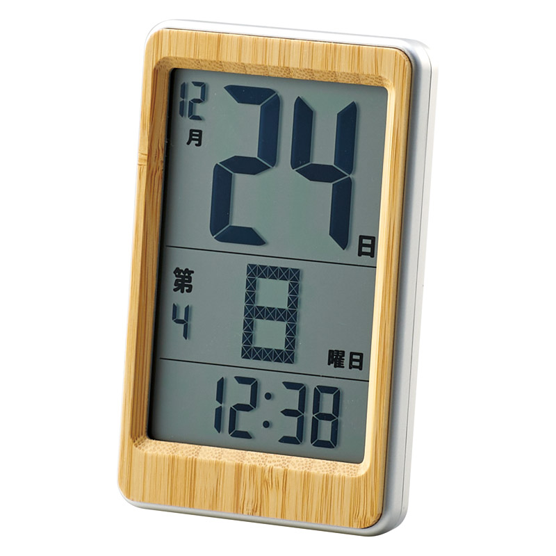 天然竹使用の手のひらサイズの日めくり電波時計。○第何曜日表示○置掛兼用○12/24時間制表示○電池切れ注意アイコン