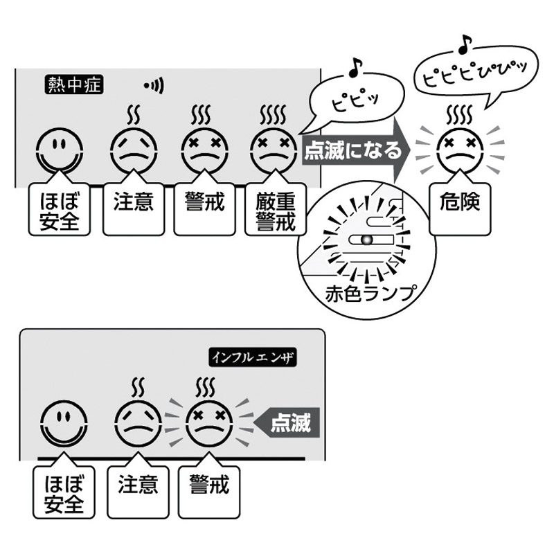 熱中症とインフルエンザ対策に!スリムな薄型デジタル温・湿度計。○温度計・湿度計○熱中症注意目安○季節性インフルエンザ感染防止目安○時刻、カレンダー表示○アラーム機能