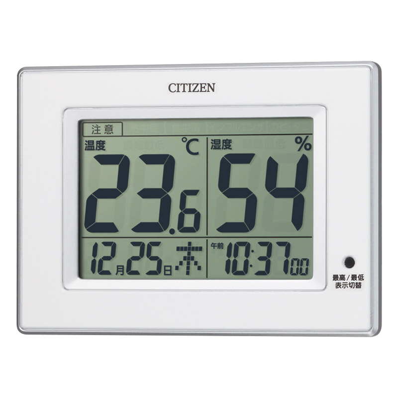 | コピー | 食中毒、熱中症、インフルエンザ、カビ・ダニが発生しやすい温度と湿度であることをお知らせする機能付の温湿度計。○高精度センサー搭載○温度(-9.9℃~50℃、精度±1℃)・湿度(20~95%、精度±3%RH)表示機能○24~25時間以内の最高/最低の温度・湿度を表示○時計機能(クォーツ)○カレンダー表示 |