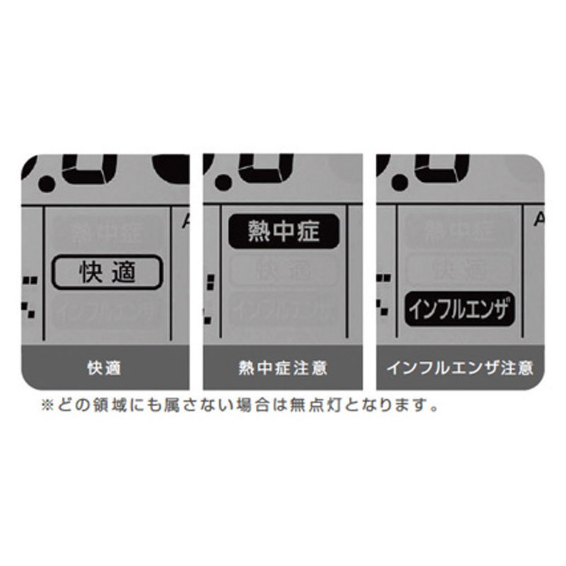 | コピー | 熱中症対策への意識が高まる中で室内環境を見える化。快適な温度・湿度の範囲が一目でわかり、快適なくらしをサポートします。○温度表示:-9.9~50℃○湿度表示:20~95%○環境目安表示:「熱中症」「インフルエンザ」「快適」表示タイプ○24~25時間以内の最低/最高値(温度・湿度)表示機能○メイン表示切替(温度・湿度/時計)○カレンダー表示○電波時計 |