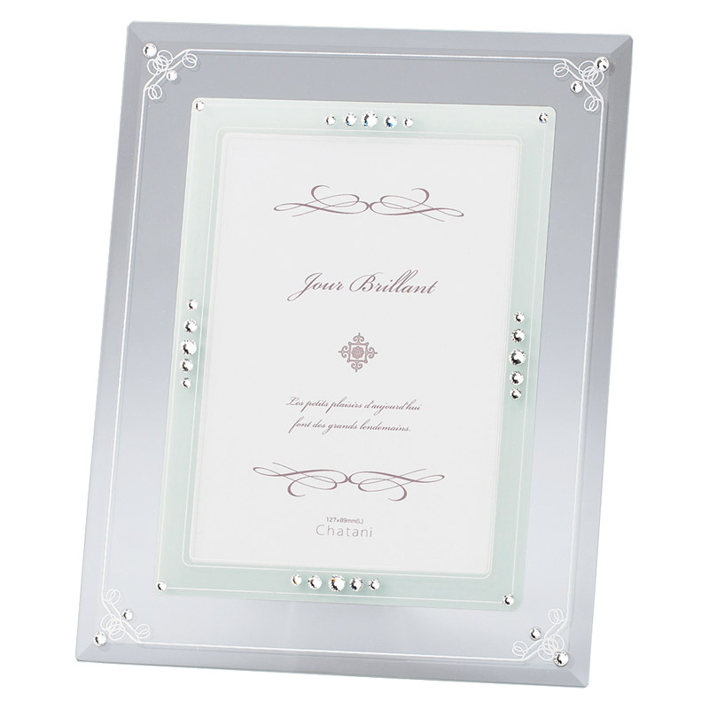 美しいガラスに施したエレガントな飾りとラインストーンが光り輝くシンプルで品の良いフォトフレーム。透明感と上品な輝きが記念日や思い出の1枚をより一層引き立てます。