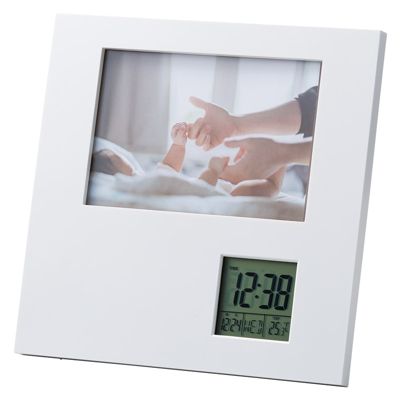 お気に入りの写真を飾れるフォトフレーム付きデジタルクロック。○クォーツ○日付表示○アラーム・スヌーズ機能○タイマー○縦置き・横置き対応