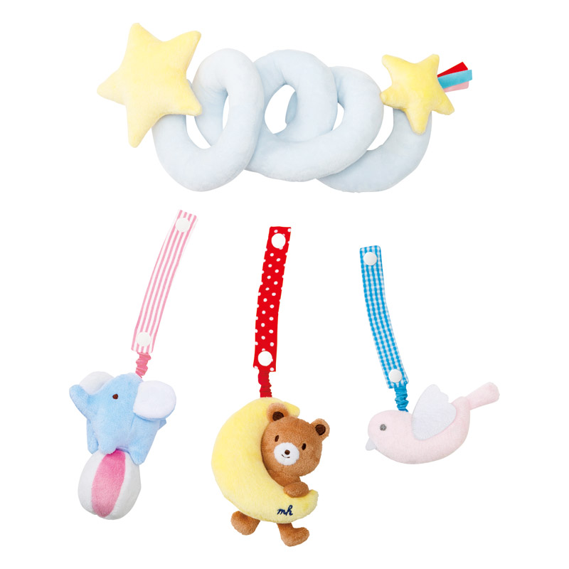 ベビーカーやベッドに取り付けることができるソフトプレイジムです。どうぶつたちは取り外して、ガラガラとして遊んでいただけます。
