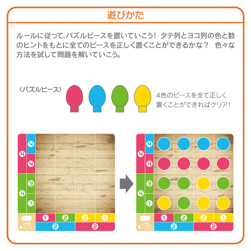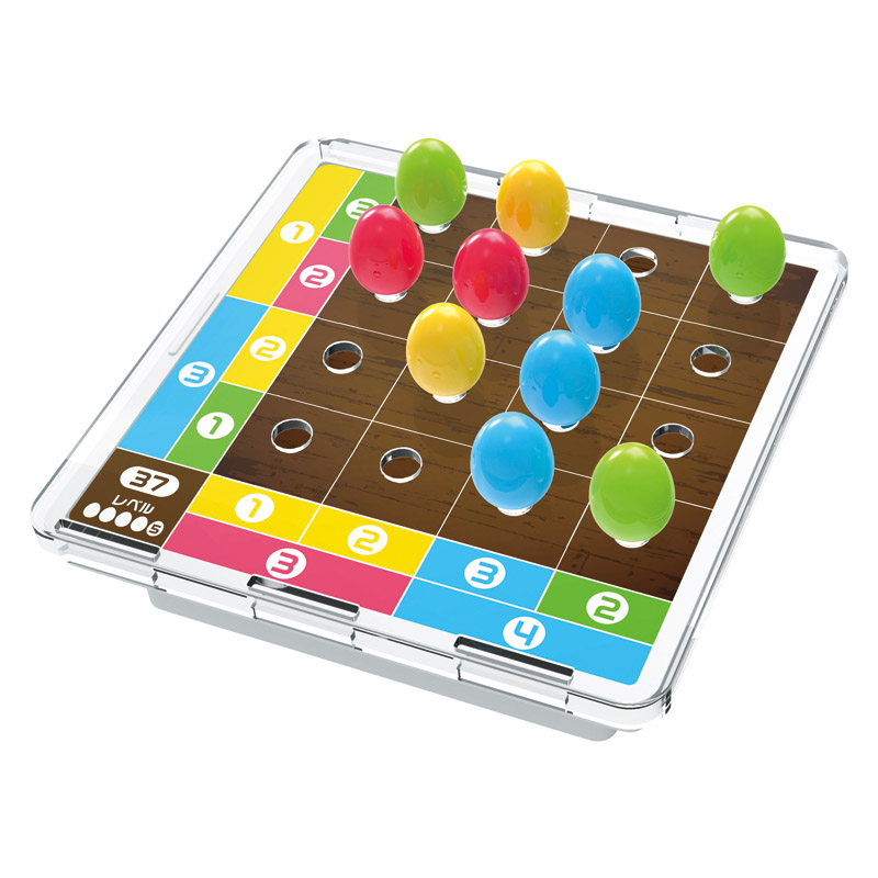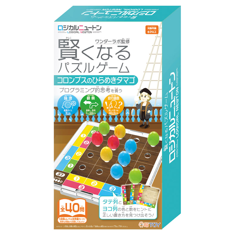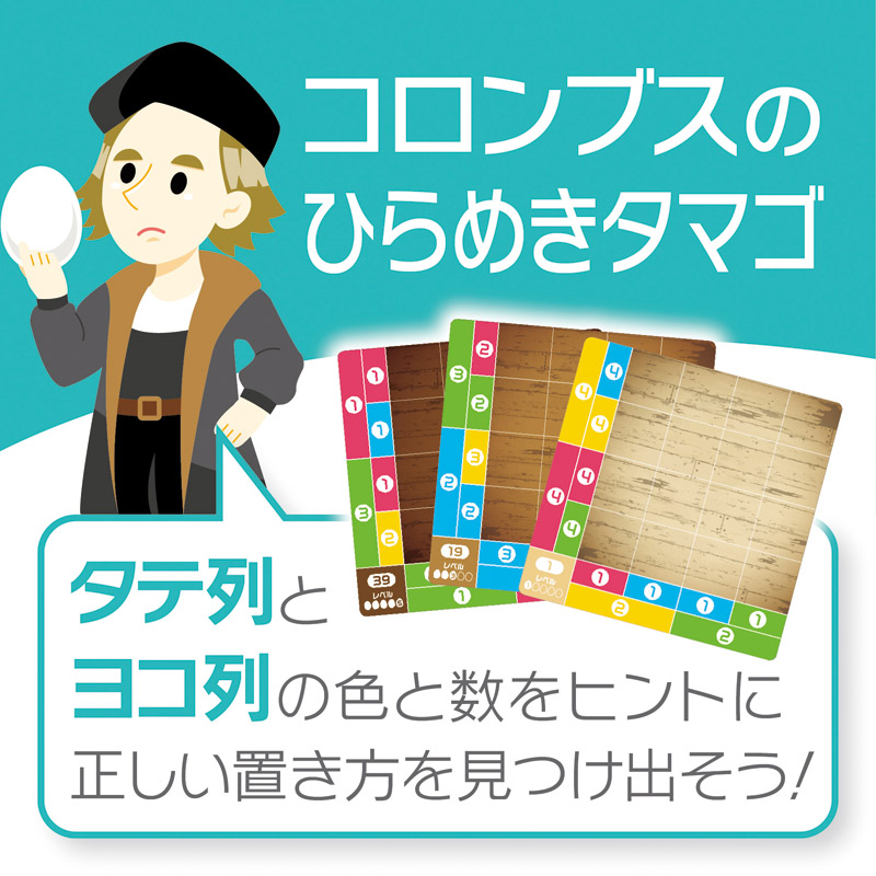 | コピー | 賢くなるパズルゲーム「ロジカルニュートン コロンブスのひらめきタマゴ」は、問題カードのタテ列とヨコ列の数と色のヒントをもとに、16個のピースを正しい場所に配置するパズルゲームです。誰でもできそうなものでも最初に行うのは難しいというコロンブスのタマゴの逸話をモチーフにしています。問題数は40問。 |