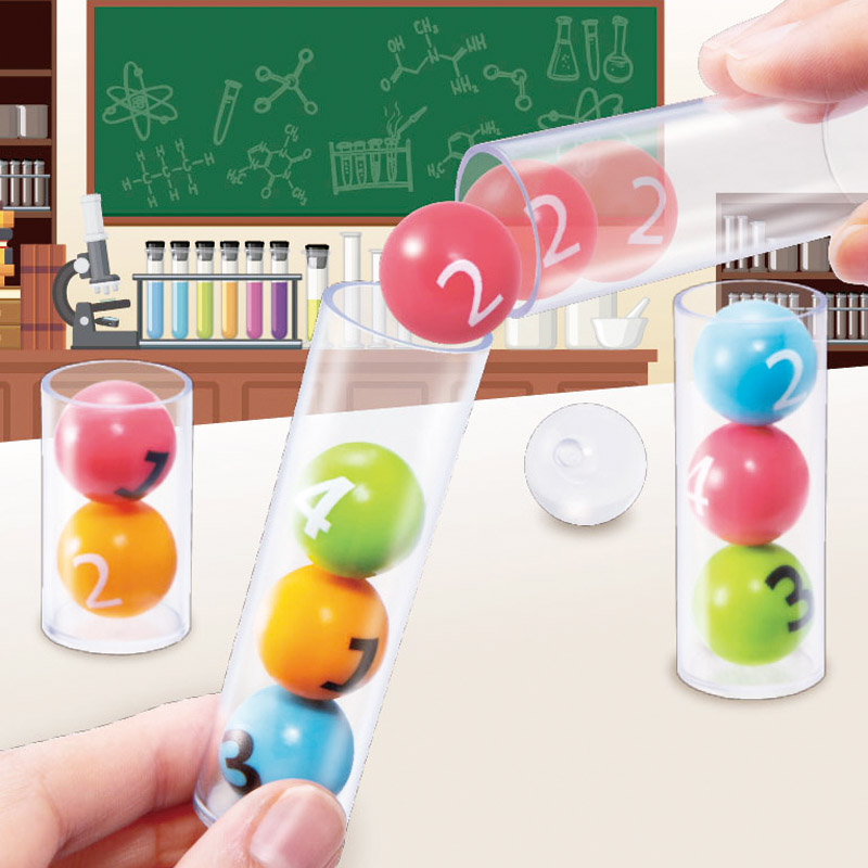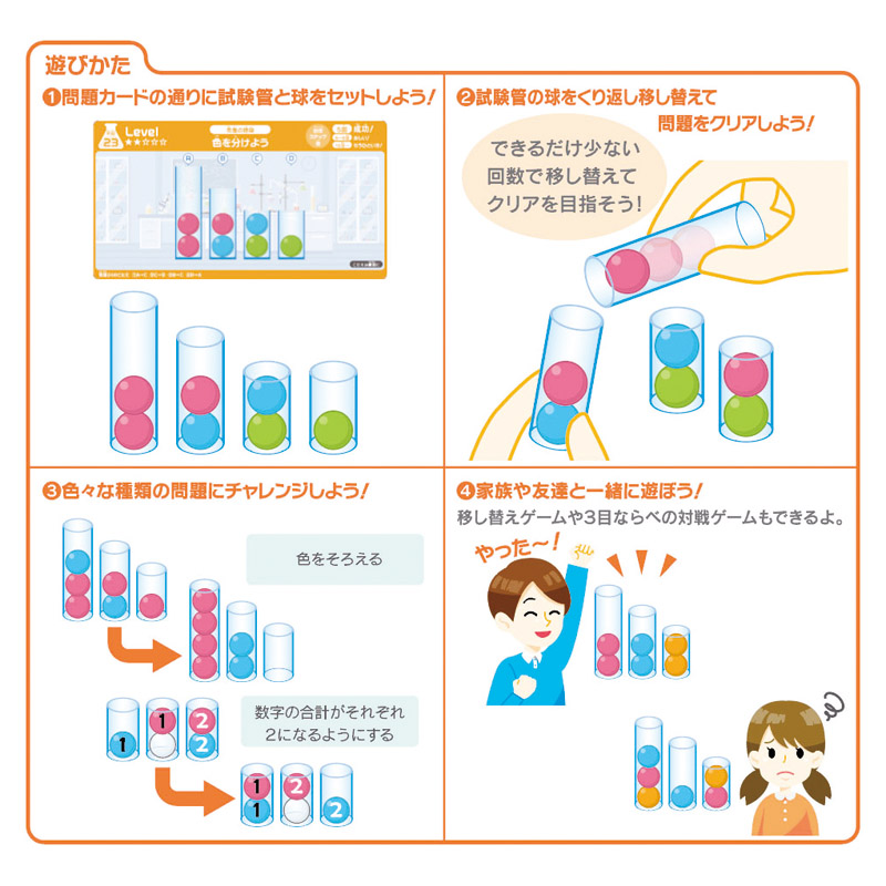 | 内容 | 試験管(S・M・L)・球(赤・青・黄・緑)×各4、球(透明)×2、問題カード×40、ゲームカード×3 |