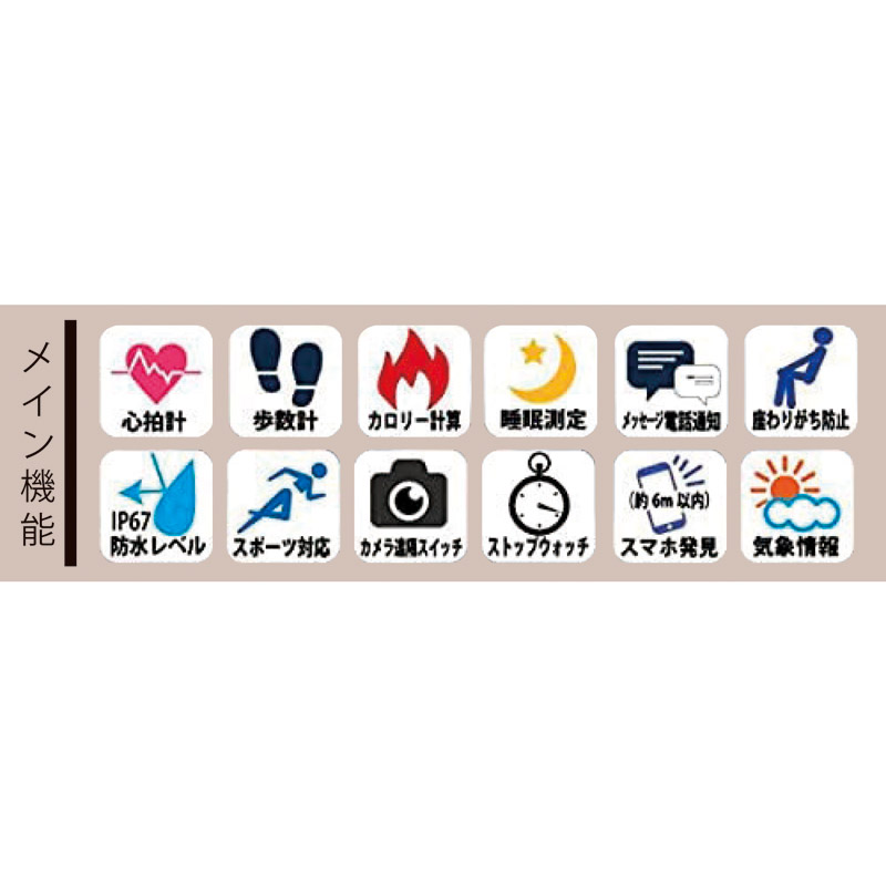毎日の生活行動確認として、歩数/距離/カロリーの数値や、各スポーツ時における消費カロリー値を手軽に知ることができるベーシックタイプのスマートウォッチです。