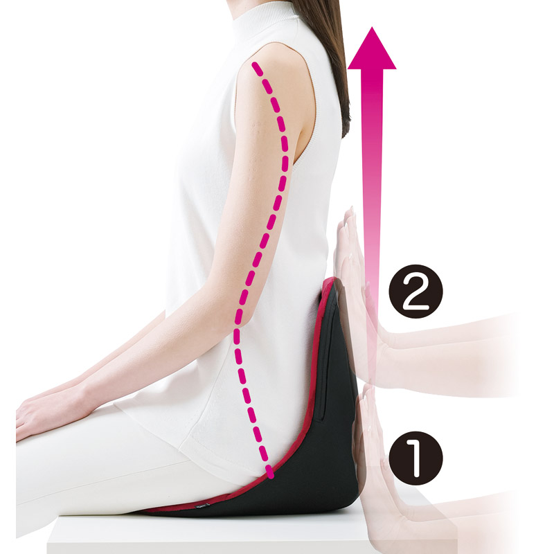 骨盤を起こして美姿勢に。背当てが前方に迫り出す。長時間気持ちいいやわらか座面。お尻に優しいクッション性でいろいろなシーンで活躍。