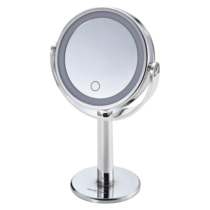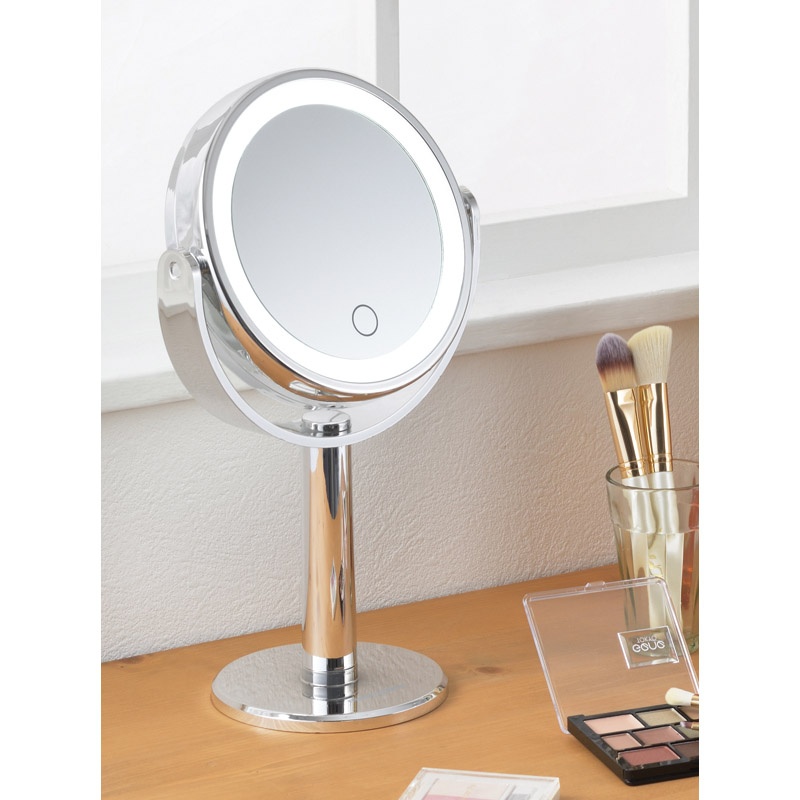 LED照明付きのスタンドミラーです。LEDが埋め込まれており、明るく照らしてメイクができます。タッチセンサーで点灯。裏面は拡大鏡になっています。