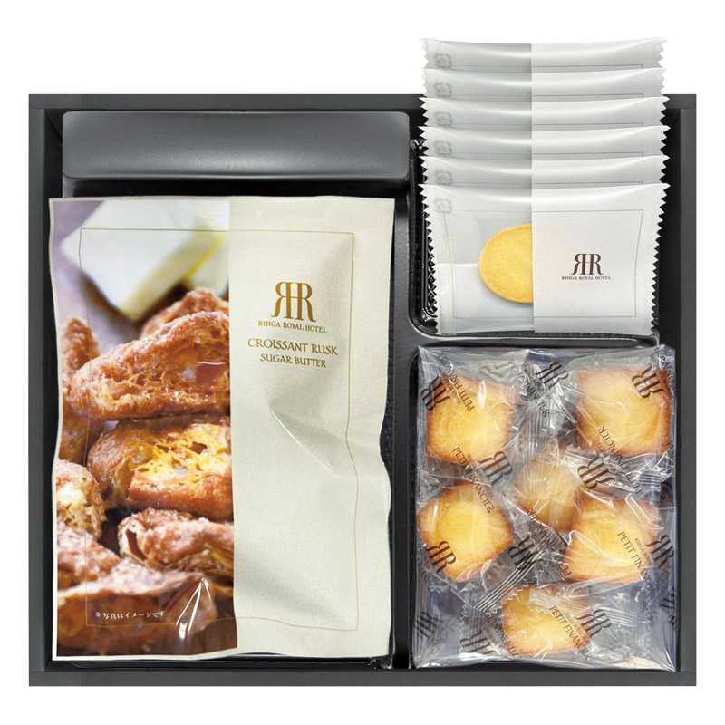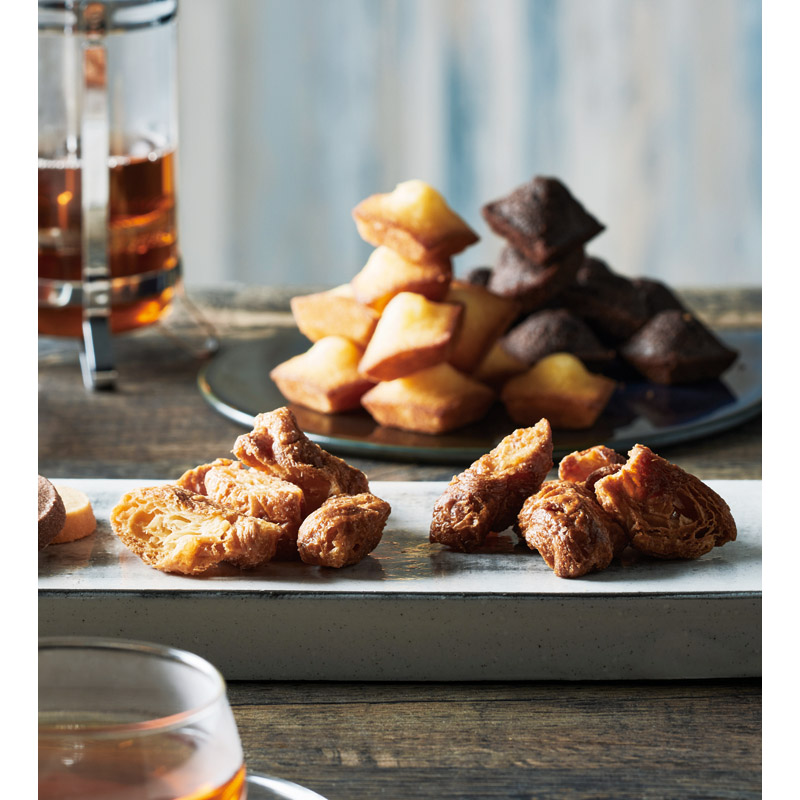 クロワッサンラスク(シュガーバター風味)・プチフィナンシェ(プレーン)(6P)×各1、クッキー(プレーンバニラ・チョコチップ)×各3 |