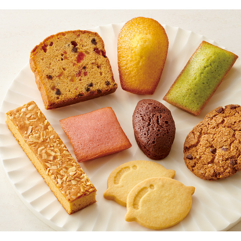 | 内容 | オレンジマドレーヌ・ピスタチオフィナンシェ×各3、ストロベリーショコラケーキ・ブラウニー×各4、ブラウンシュガーパウンドケーキ・アーモンドキャラメルケーキ×各2、チョコチップクッキー・レモンクッキー×各5 |