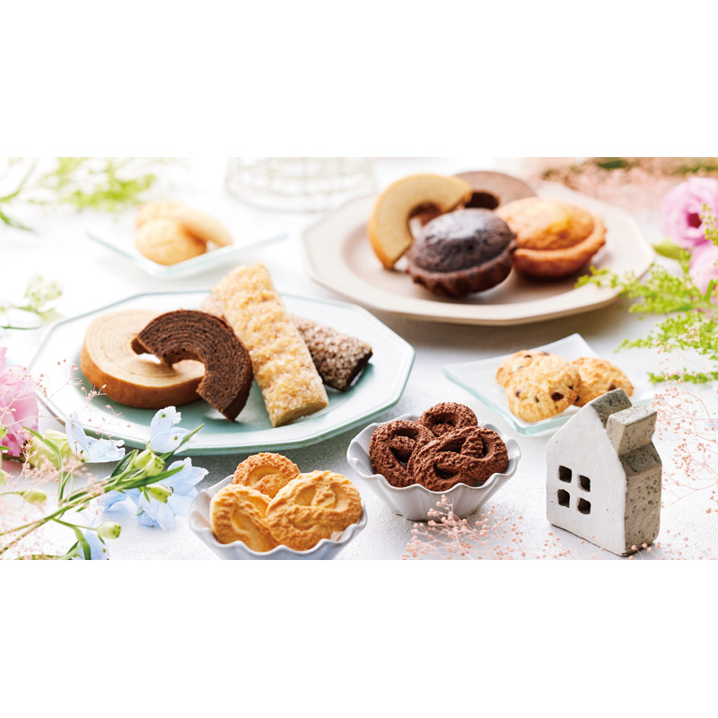 クッキー(ミルク・メープル・ショコラ・チョコチップ)×各2、スティックパイ(メープル・ショコラ)・マドレーヌ(プレーン)・バウムクーヘン(バニラ・ココア)×各1