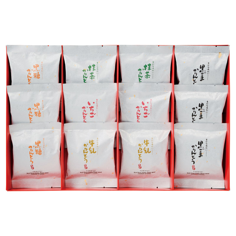 黒糖かりん糖(10g)・黒胡麻かりん糖(10g)×各3、牛乳かりん糖(10g)・抹茶かりん糖(10g)・いちごかりん糖(10g)×各2