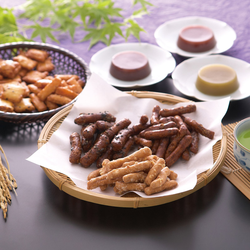 | 内容 | 蜂蜜黒糖かりんとう(40g)・羊かん(抹茶・練り)(60g)×各1、あられ(海老)(12g)×3、あられ(海苔)(12g)・あられ(味噌)(12g)×各2 |