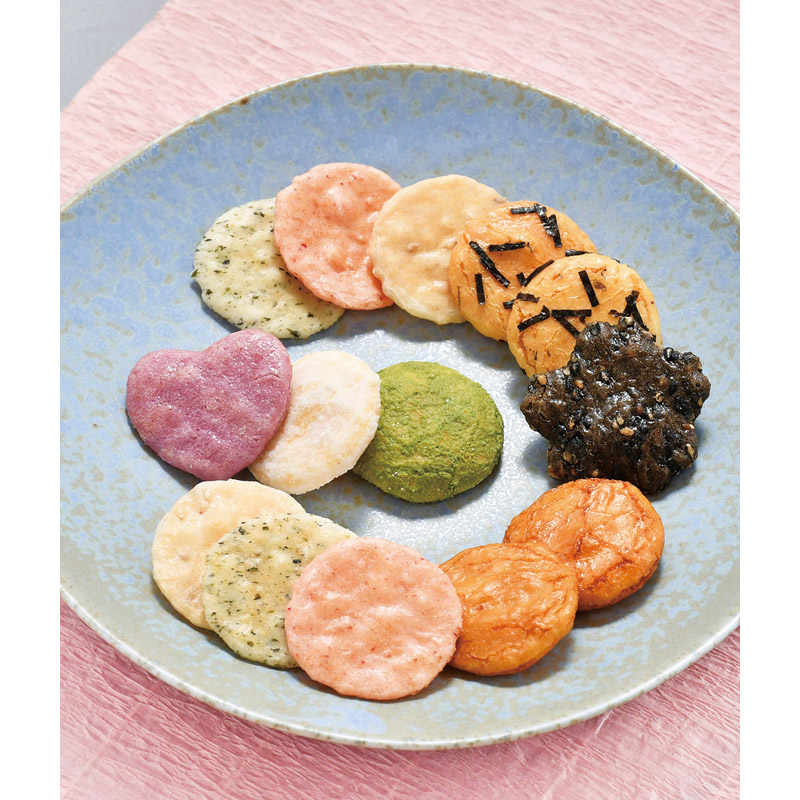深みのある味わいのお煎餅から、紫いもの優しい甘さのお煎餅、胡麻の風味が香ばしいお煎餅、抹茶の上品な風味のお煎餅、ぱりぱり食感の薄焼きサラダ煎餅まで9種類14枚の小分けセット。味わい、楽しさが豊かに広がる一品です。