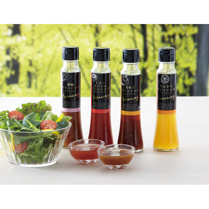 しょうがドレッシング(100ml)・胡麻ドレッシング(100ml)・とまと&バジルドレッシング(100ml)・玉ねぎドレッシング(100ml)・ひまわり油(90g)×各1