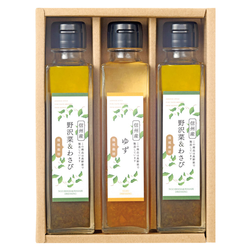 野沢菜&わさびドレッシング(150ml)×2、ゆずドレッシング(150ml)×1