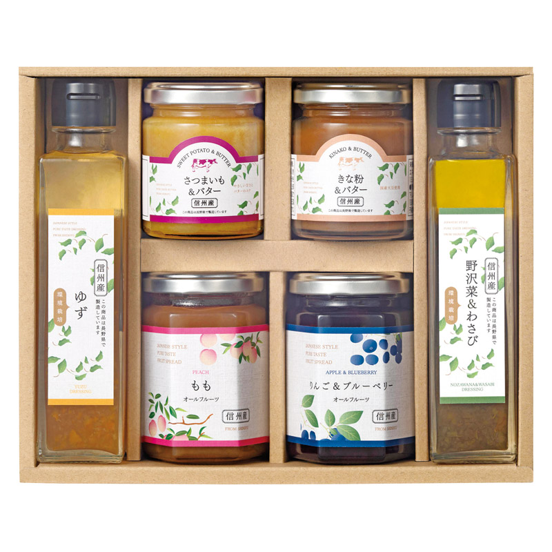 | 内容 | ももスプレッド(140g)・りんご&ブルーベリースプレッド(140g)・さつまいも&バターペースト(110g)・きな粉&バターペースト(110g)・ゆずドレッシング(150ml)・野沢菜&わさびドレッシング(150ml)×各1 |