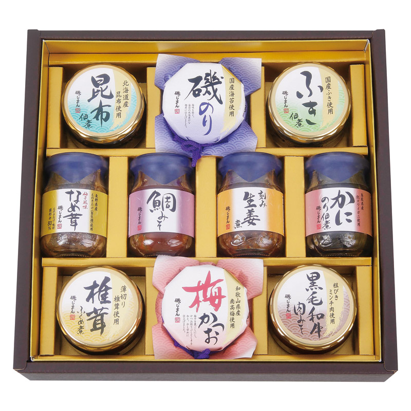 | 内容 | 昆布佃煮(70g)・磯のり(90g)・ふき佃煮(50g)・椎茸ふくめ煮(85g)・梅かつお(90g)・黒毛和牛肉みそ(90g)・柚子風味なめ茸(85g)・鯛みそ(100g)・刻み生姜煮(90g)・かにのり佃煮(90g)×各1 |