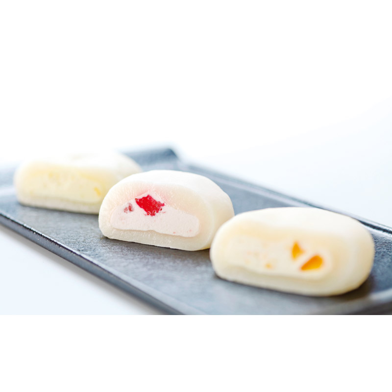 ふんわり食感にこだわって作った生クリーム大福 北海道生クリームに岡山県産清水白桃、瀬戸内産レモン、そしていちごのダイスカットを加え、マシュマロのように柔らかく、ふわふわなお餅で包みこみました。
