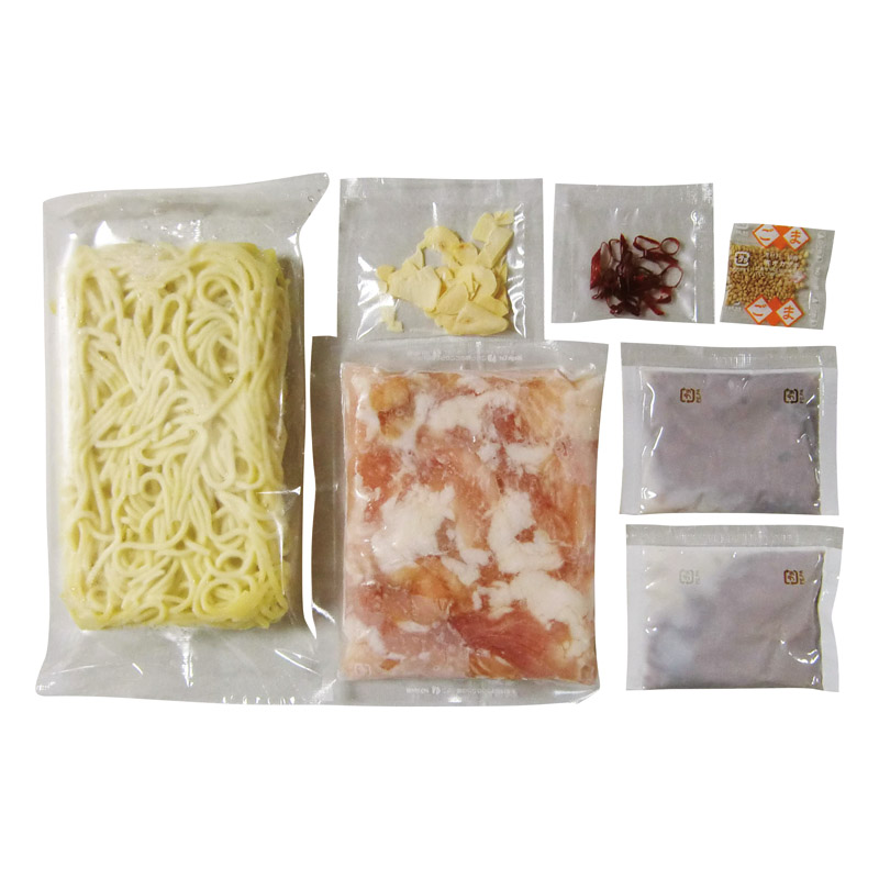 | 内容 | 牛もつ肉(国内産)(100g)・ちゃんぽん麺(180g)・にんにく(3g)・唐辛子(0.5g)・白ごま(0.7g)×各1、もつ鍋用濃縮とんこつスープ(36g)×2 |