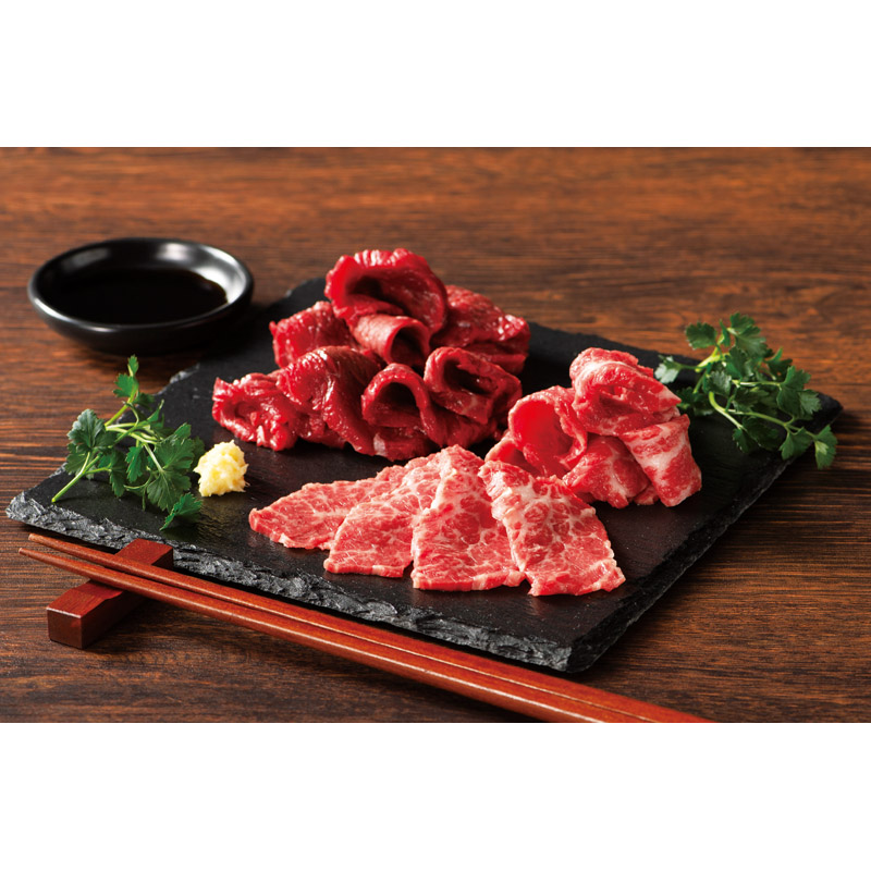 | 内容 | ふじ馬刺し上赤身(80g)・ふじ馬刺し中トロ(80g)×各1、馬刺し用たれ(5ml)・生姜小袋(3g)×各4 |