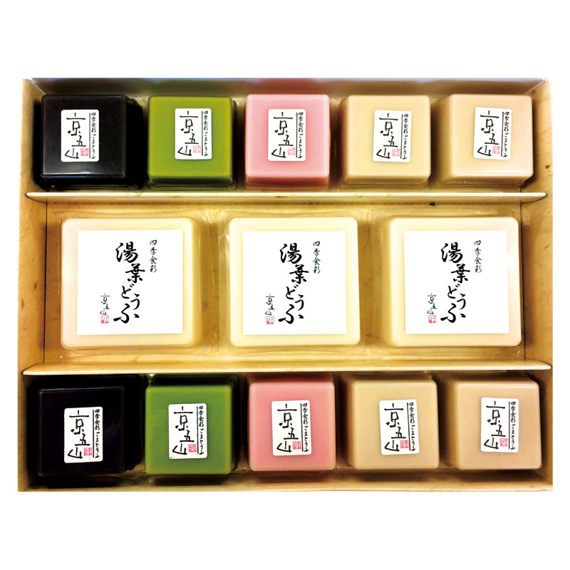 京都 北野天満宮傍の胡麻豆腐専門店「京五山」の人気商品、ごまとうふと湯葉どうふの詰合せとなります。いろんな味を食べ比べられるちょっと贅沢な詰合せです。