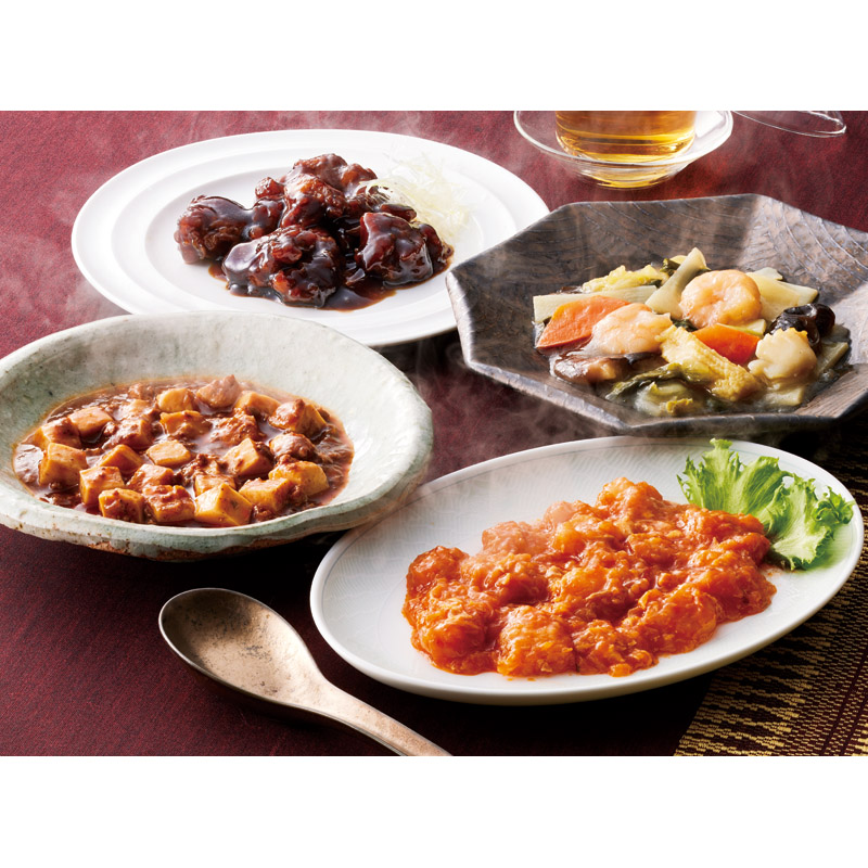 | 内容 | ずわい蟹入りエビチリソース(130g)・黒醋酢豚(150g)・麻婆豆腐(豆腐入り)(150g)・彩り八宝菜(150g)×各1 |