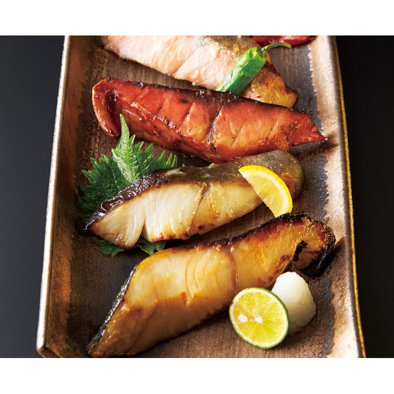 本鰆西京漬(80g)×2、銀だら粕漬け(80g)・カジキみそ漬(80g)・まぐろみりん漬(80g)・まぐろハラモみりん漬(80g)×各1