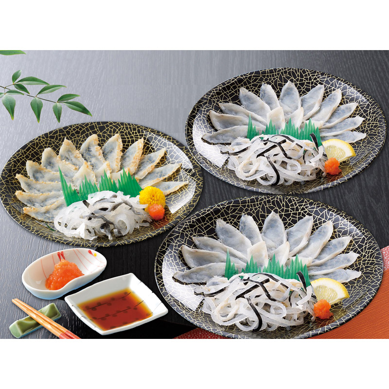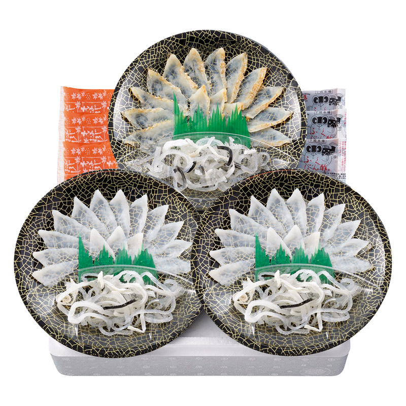 | 内容 | 真ふぐ霜降り刺身(20g)×2、真ふぐたたき刺身(20g)×1、とらふぐ皮(20g)・ふくポン酢(10g)・もみじおろし(10g)×各3 |