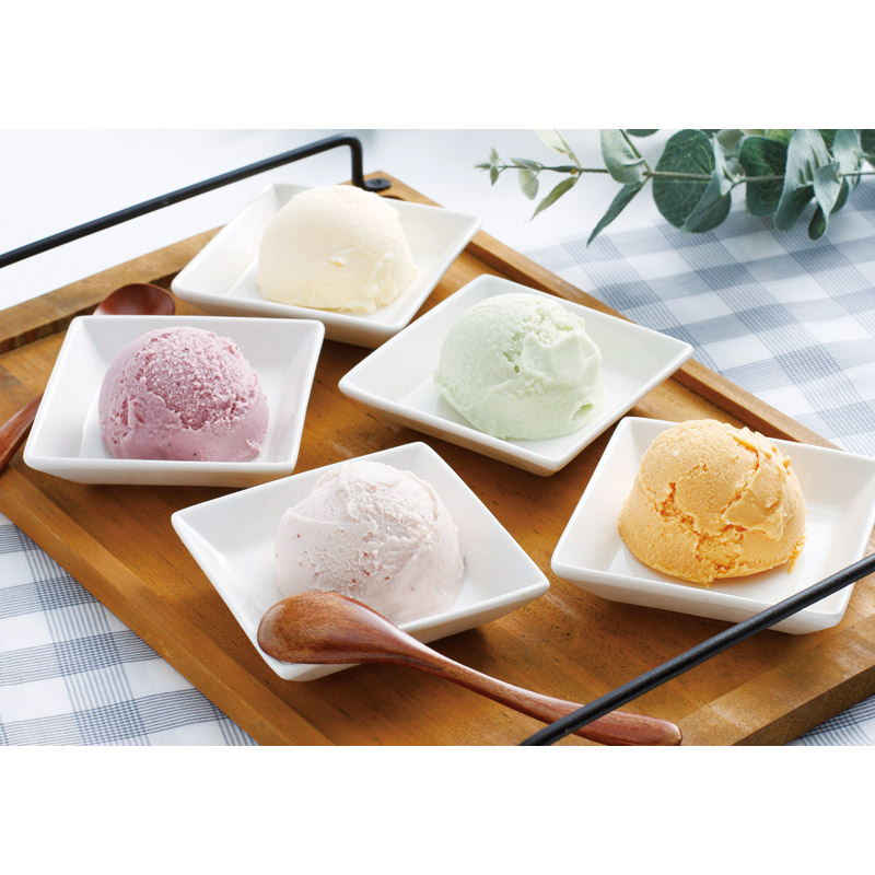 北海道牛乳を使用したアイスセット。人気のバニラに赤肉・青肉メロンやハスカップ、ストロベリーの4種のフルーツの味も楽しめます。