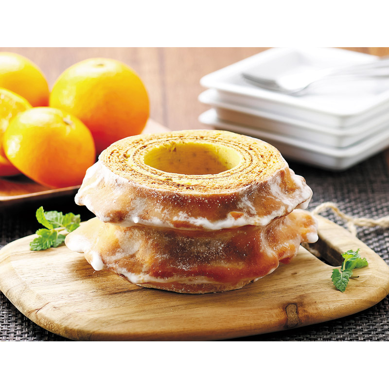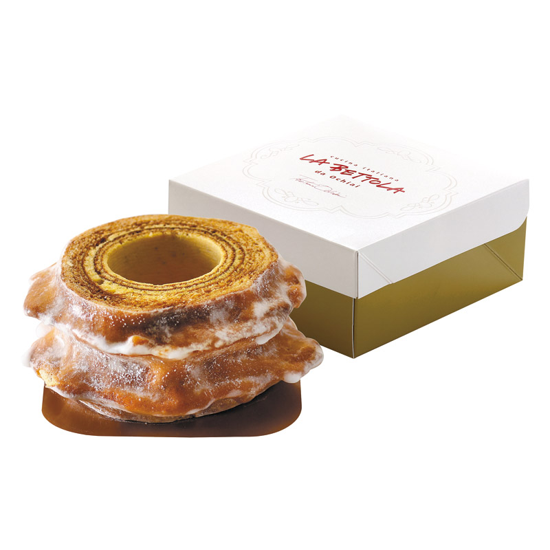 | コピー | 「ラ・ベットラ・ダ・オチアイ」落合シェフ監修の、オレンジピールを細かく刻んで生地に練り込み焼き上げたバウムクーヘンです。内側はしっとり、シュガーコーティングした外側はサクッとした食感です。 |