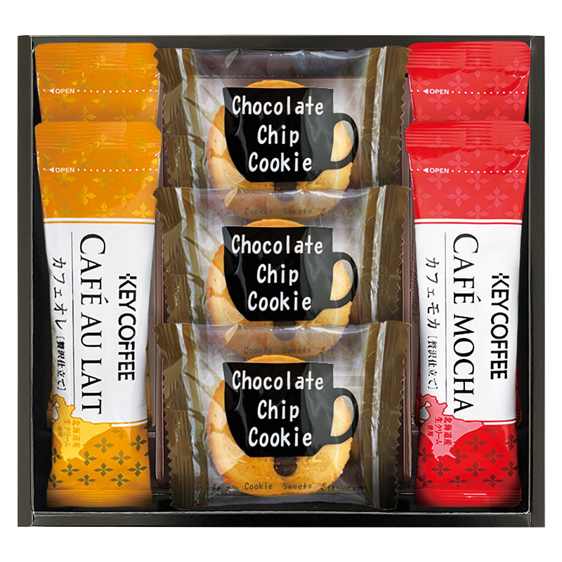 チョコチップクッキー×3、キーコーヒーカフェオレスティック(7g)・キーコーヒーカフェモカスティック(7.8g)×各2